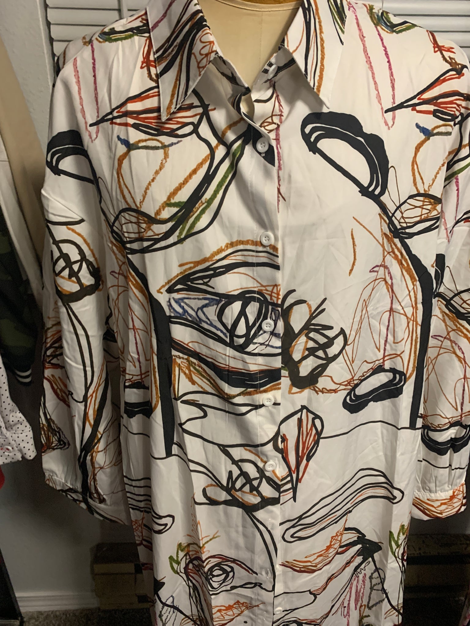 Like new, plus size graffiti print, button down, lapel neck shirt dress. Can be worn over pants also.